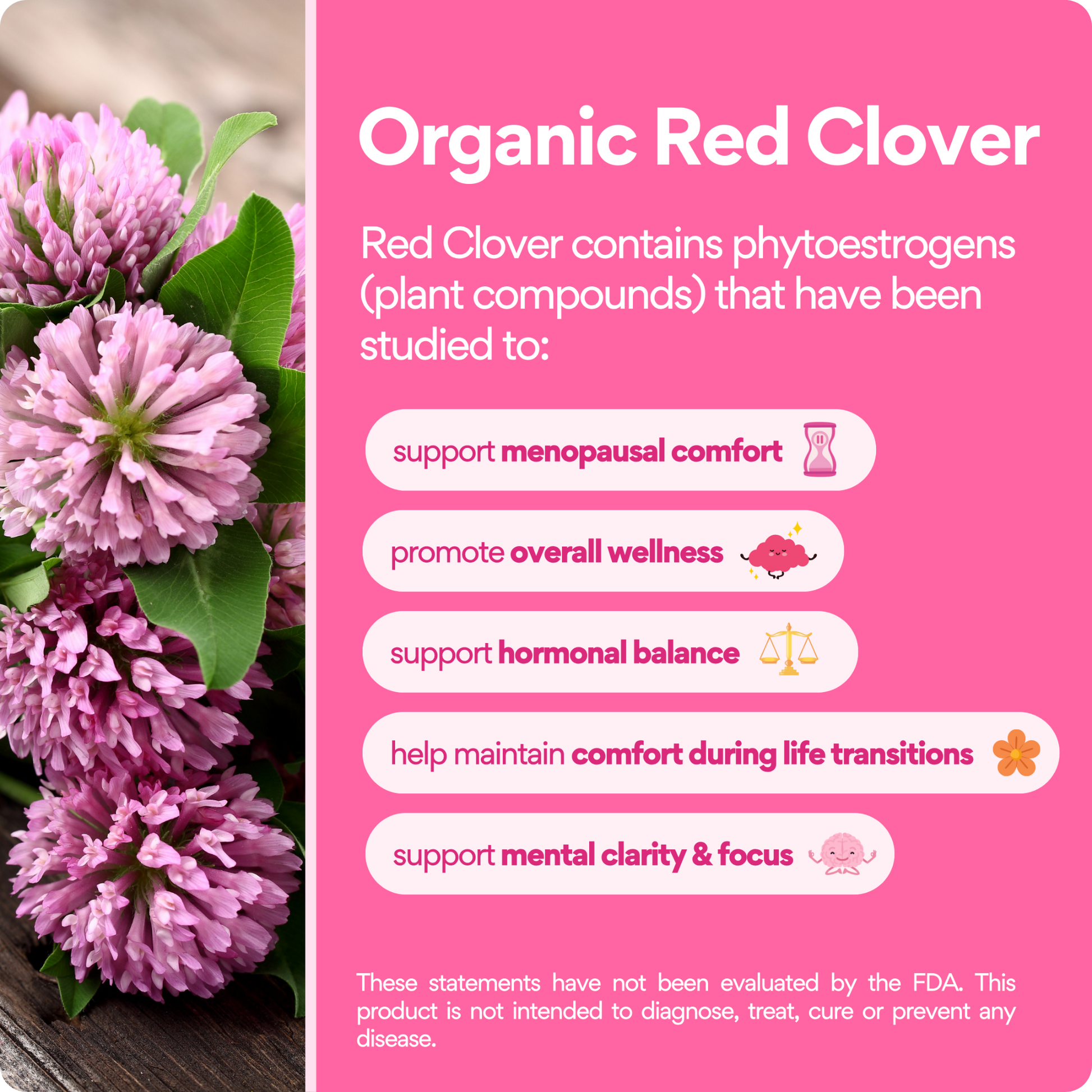 Red Clover contains phytoestrogens that have been studied to support menopausal comfort, promote overall wellness and support hormonal balance
